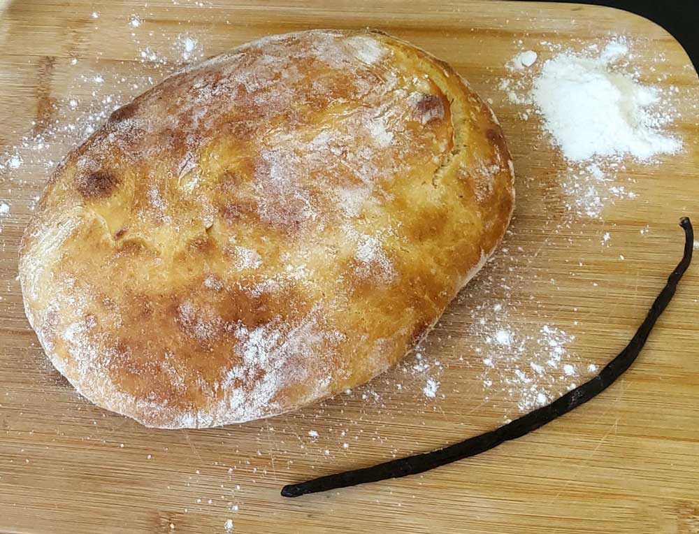 - Verser dans le bol du robot (ou dans un grand bol si vous pétrissez à la main) la farine, l’eau tiède, les grains de vanille, la levure, le sucre et le sel