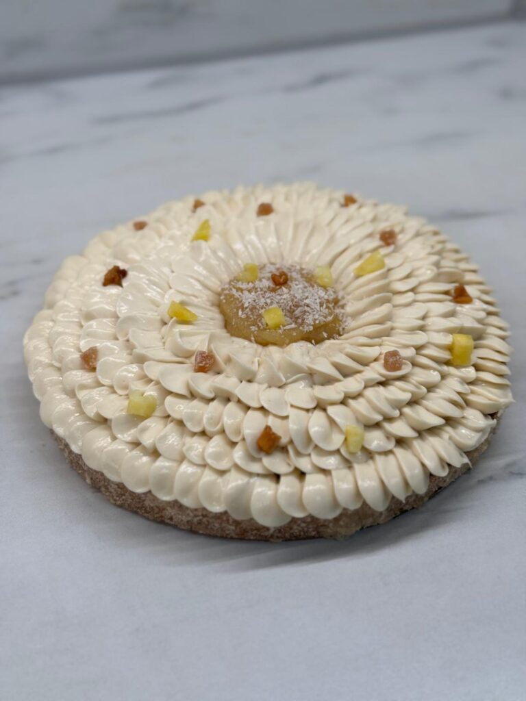 ➡️ Mélanger tous les ingrédients. Garnir la pâte précuite de crème de coco, ajouter le gingembre et l’ananas confits, et l’ananas frais. Cuire 15min à 170C. Ajouter un mélange de sucre roux et de coco râpé sur les bords grâce à un peu de dorure puis cuire 5min.