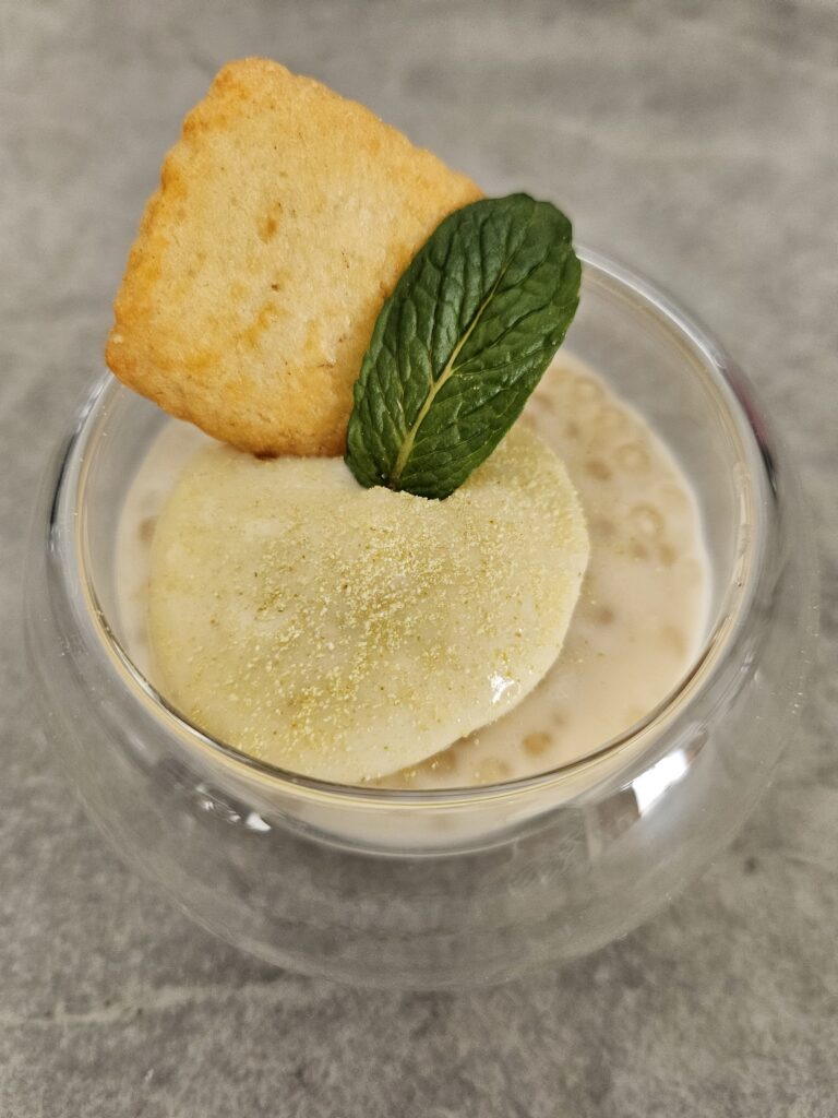 Répartir la crème au combava dans chaque verrine, par-dessus les perles au coco. Réserver au frais.